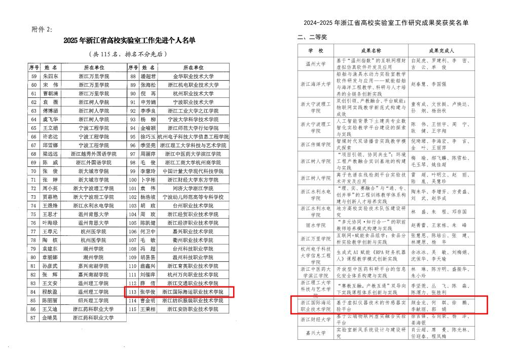 近日,浙江省高等教育学会实验室工作分会公布2025年浙江省高校实验室工作先进评选结果及2024-2025年浙江省高校实验室工作研究成果奖获奖名单。我校海洋装备工程学院实验实训中心主任张学俊老师获评2025年浙江省高校实验室工作“先进个人”,颜金龙老师主持申报的“基于虚拟仪器技术的传感器实验平台”项目荣获2024-2025年浙江省高校实验室工作研究成果奖二等奖,彰显我校实验室建设与管理工作的扎实成效。