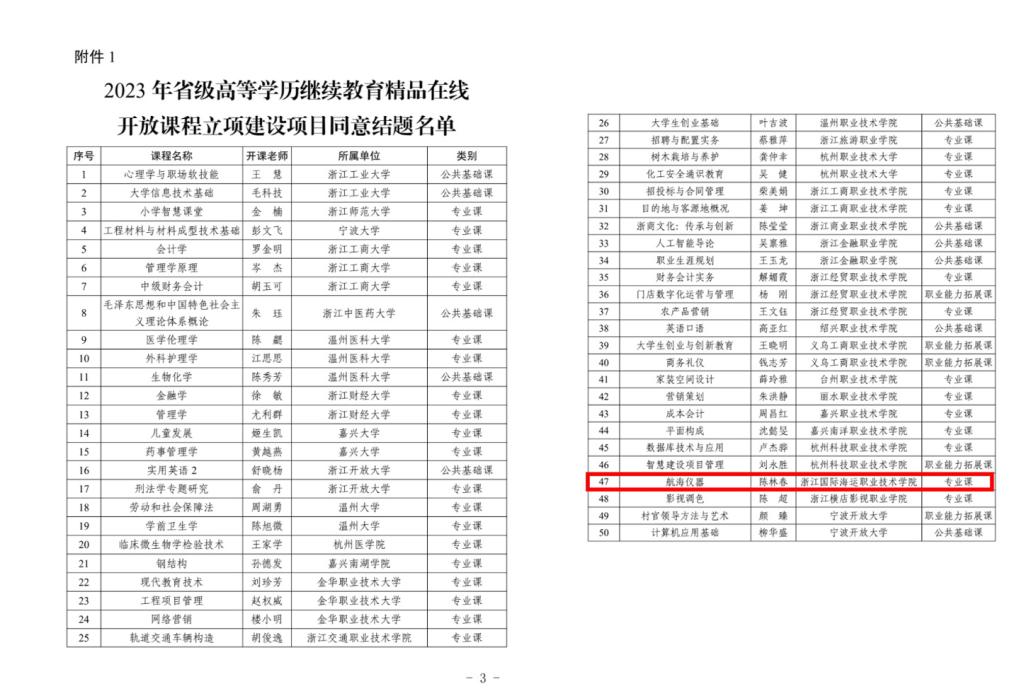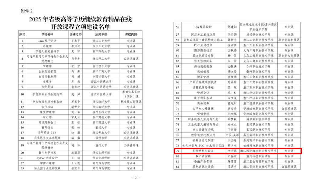 近日,浙江省教育厅正式发布了《关于公布高等学历继续教育精品在线开放课程2023年立项建设项目同意结题名单和2025年立项建设项目名单的通知》,我校陈林春老师的《航海仪器》专业课顺利通过结题验收,李子强老师的《船舶结构与设备》专业课成功立项。
