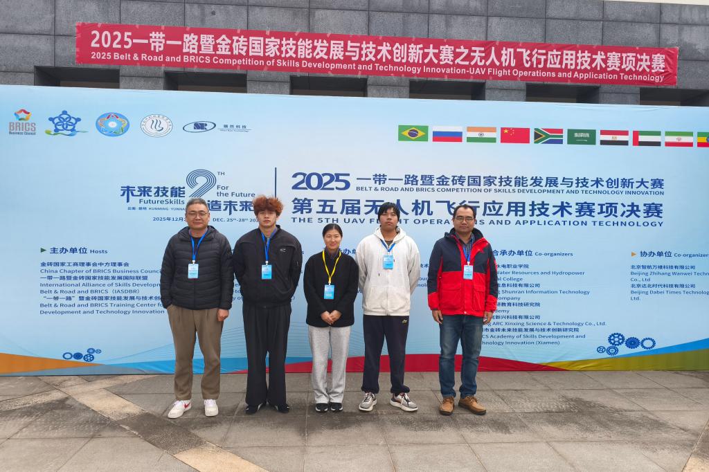 12月25日-28日,2025一带一路暨金砖国家技能发展与技术创新大赛第五届无人机飞行应用技术赛项决赛在云南水利水电职业学院圆满落幕。由我校海洋装备工程学院卓宏明、于朋涛两位老师指导,黄科龙、黄书文两名同学组成的参赛队,凭借精准的飞行操控与高效的故障排查能力,荣获学生高校组一等奖,并以决赛第3名的优异成绩晋级北非国际赛未来技能挑战赛;施鑫煜老师则在教师组竞赛中脱颖而出,斩获一等奖且以第3名的成绩晋级北非国际赛技术创新大赛。