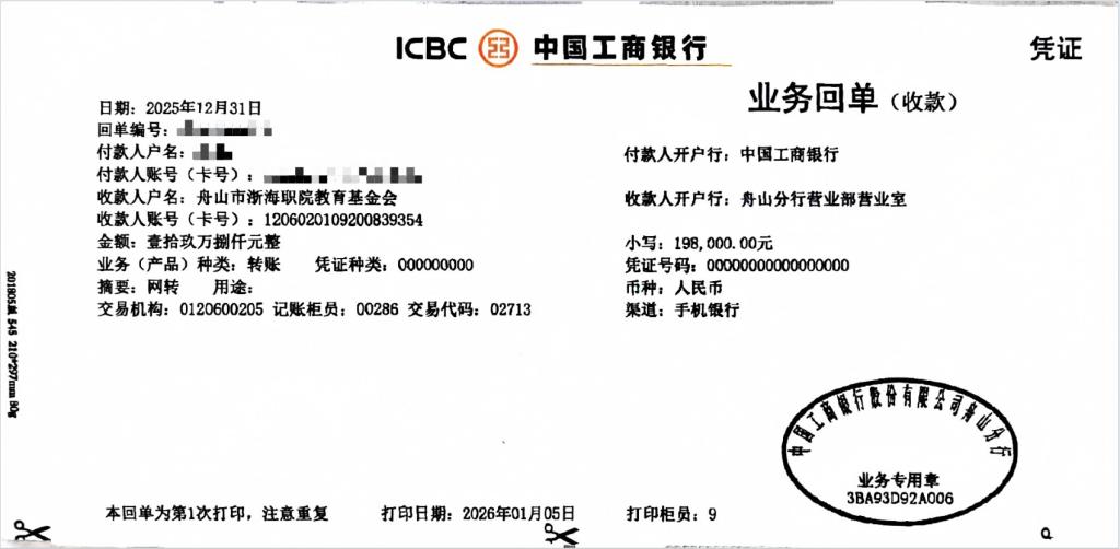 2026年新年伊始,舟山市浙海职院教育基金会(以下简称“基金会”)收获了一份特殊的新年贺礼——一笔来自匿名爱心人士的19.80万元捐赠善款。这份珍贵的爱心礼,不仅为学校高等职业教育事业发展注入温暖动能,更彰显了社会各界对职业教育的深切关怀与鼎力支持。