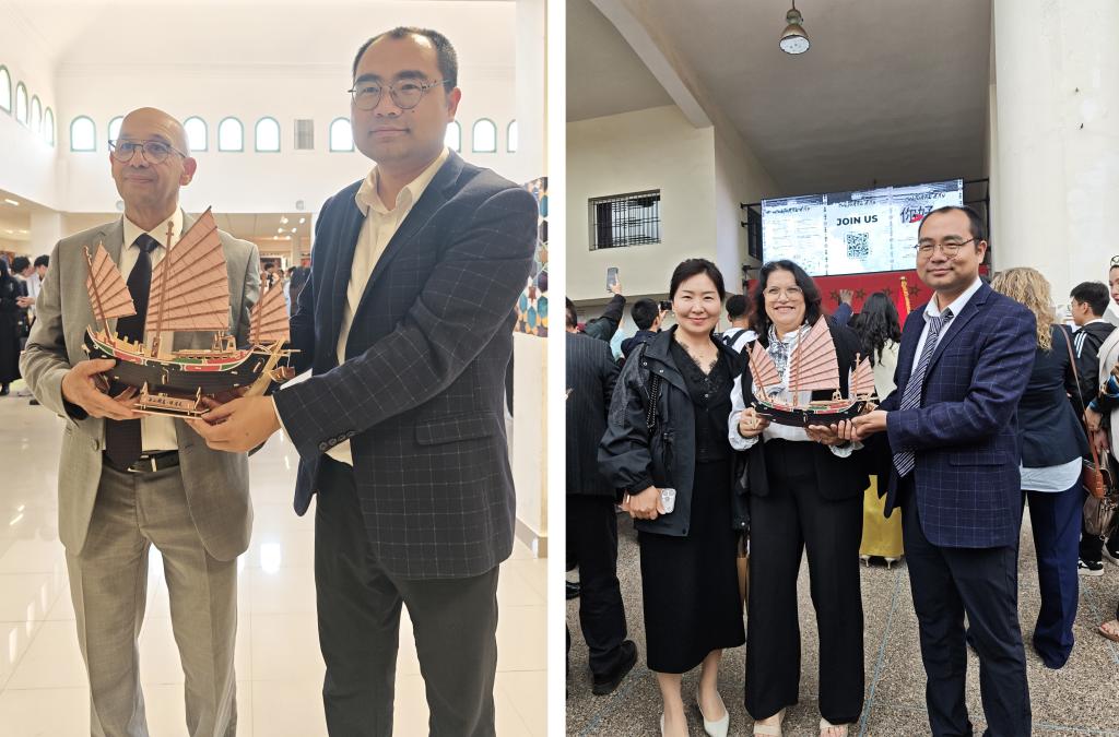 赛事期间,海洋装备工程学院副院长卓宏明代表学校,向摩洛哥哈桑一世大学、哈桑二世大学赠送舟山“绿眉毛”古船模型,以海洋文化为纽带深化丝路友谊。团队还参观摩洛哥教育部职业培训署(CMC)实训基地,深入了解北非职业教育体系与实训模式,为校际合作、职教出海搭建桥梁。