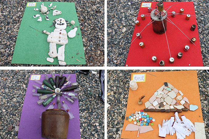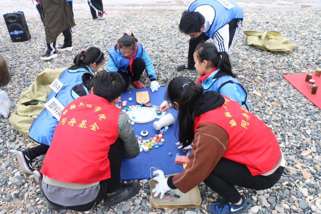 在活动现场,志愿者们埋头清理海滩边的垃圾并仔细分类。在大家的共同努力下,短短几个小时,就清理并分类了160公斤重的垃圾。在“同舟基金”志愿者哥哥姐姐的帮助和指导下,志愿小天使们还纷纷发挥想象力和动手能力,变废为宝,将捡到的废品设计成形状各异、独具匠心的别致展品。