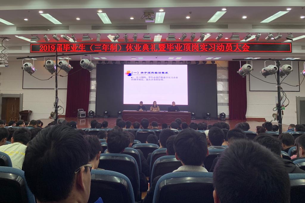 11月23日下午,船舶工程学院2019届毕业生(三年制)休业典礼暨毕业顶岗实习动员大会在图书馆四楼报告厅举行,学院行政班子、专业团队负责人、全体2016级毕业生、学业导师、辅导员及实习指导老师参加了会议。会议由学院党总支副书记李刚主持。