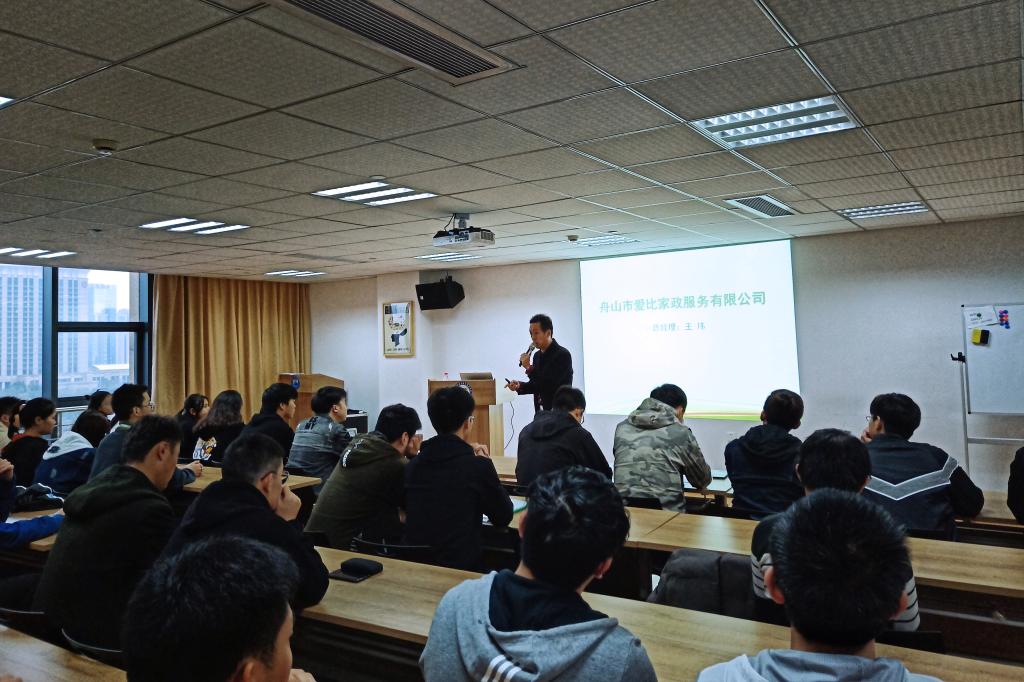 王玮与同学们分享了他从军、就业、创业三段人生经历,初次创业失败时的彷徨,如何凭借坚持不懈的毅力、认真务实的态度再次创业,他建议同学们在创业途中要注重团队建设、关爱员工、坚定信念,并始终抱持感恩、真诚的人生理念。王玮创办的舟山市爱比家政有限公司注册资本150万元,现有员工数180人。他曾多次获得舟山市创新创业大赛奖项,担任舟山市群岛新区青年创业者协会理事、普陀军创园区党支部书记。