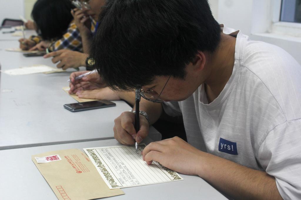 感恩贺卡书写活动更是受到了学院所有在校学生的欢迎,周六没有晚自习的教室里坐满了给妈妈写信、写卡片的同学们,对当代青年来说,用书写的形式表达爱意是“复古”而又“时髦”的,写信对他们来说是新鲜的,但对父母们来说却是怀旧的,一封封充满爱意的信件和卡片都将通过邮递员的双手传递到母亲身边。(图文/林芷伊)
