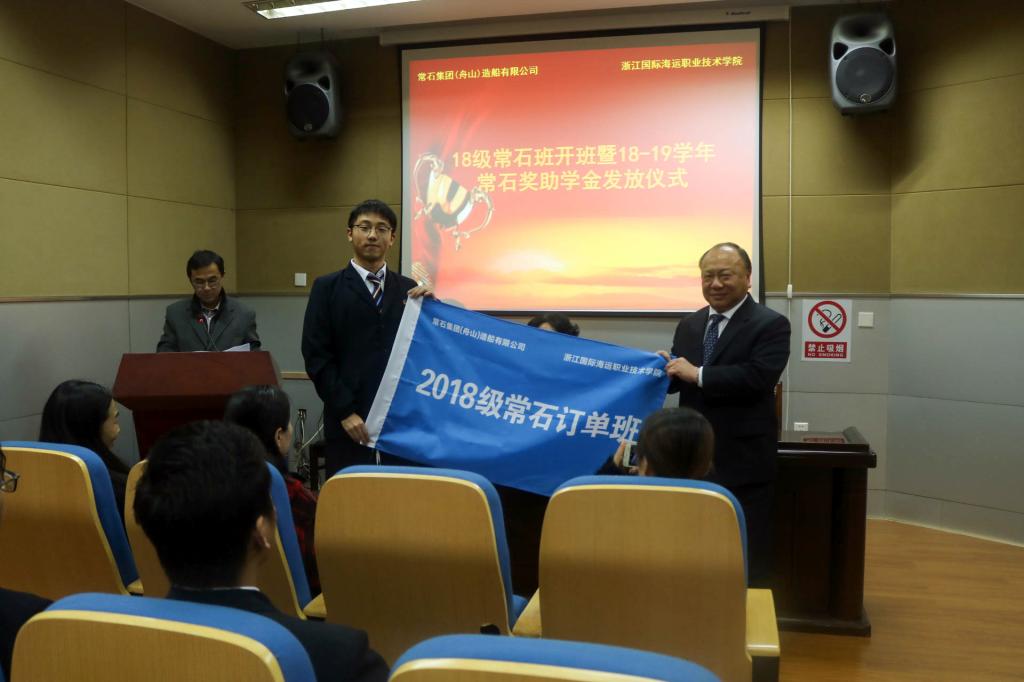 李海波首先介绍了常石集团以及常石订单班的基本情况,并对常石集团长期以来对学校教育工作的大力支持表示感谢。李家亮为2018级“常石班”学生授旗并宣布开班。