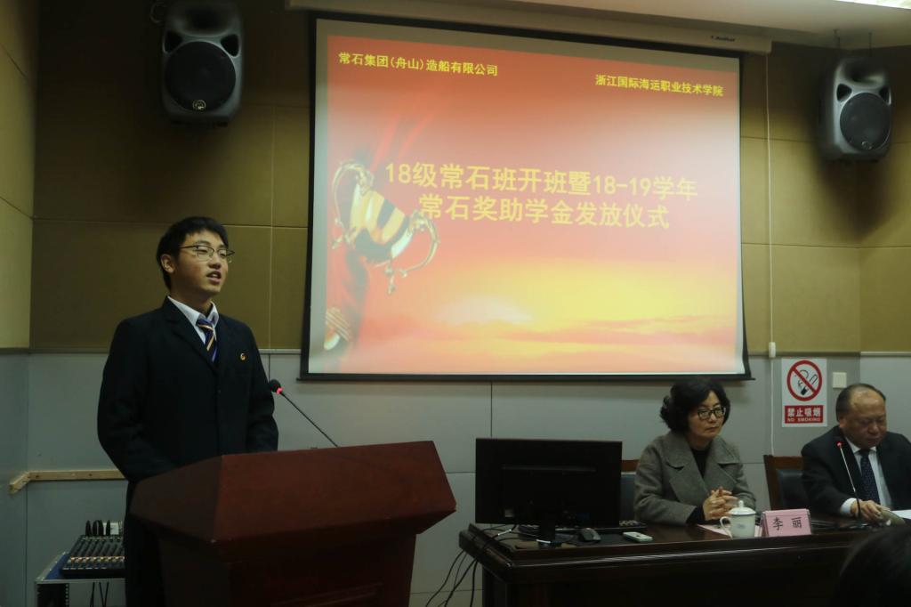 12月20日,2018级“常石”订单班开班暨2018-2019学年奖助学金发放仪式在船舶工程实训楼万邦厅举行。常石集团(舟山)造船有限公司副总经理李家亮、人事课长虞梦晓,学校副校长李丽、学生处处长芮明珠、教务处副处长郭娟,船舶工程学院行政班子、教师代表、辅导员以及2018级常石订单班全体学生参加了仪式。仪式由船舶工程学院院长李海波主持。