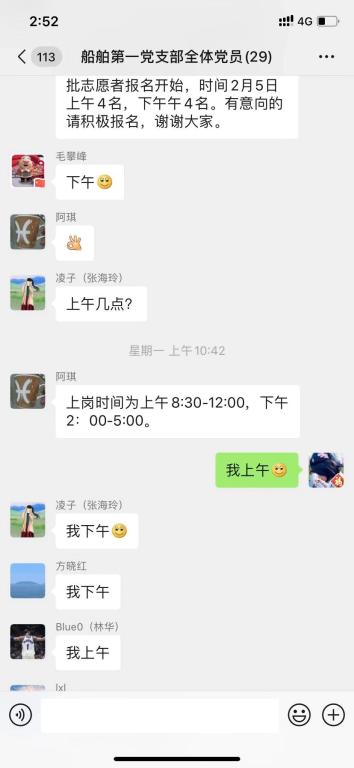 船舶工程学院党总支第二支部的党员则以辅导员为主,为了能第一时间通知到所有同学、搜集到所需信息,第二支部的党员们线上线下联动,通过公众号发布、QQ、微信等方式,确保所有通知第一时间传达到学生,没有收到回复决不罢休,有的党员一人带7个班级,一天的拨出通话记录有80多条;有的学生假期作息颠倒,白天找不到人只能晚上找,联系不上就打家长电话……