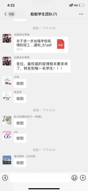 面对疫情,船舶工程学院的党员们秉承“同舟共济”的团结精神,给每个船舶师生带去了第一手通知,让学生、家长和老师们感受到了学校的温暖和牵挂。