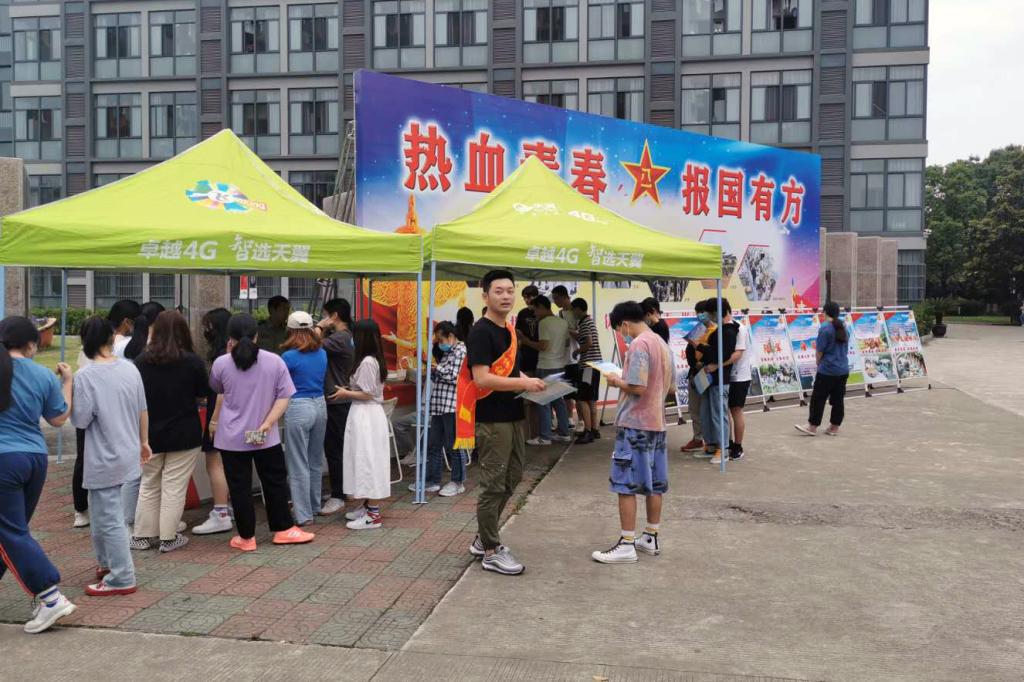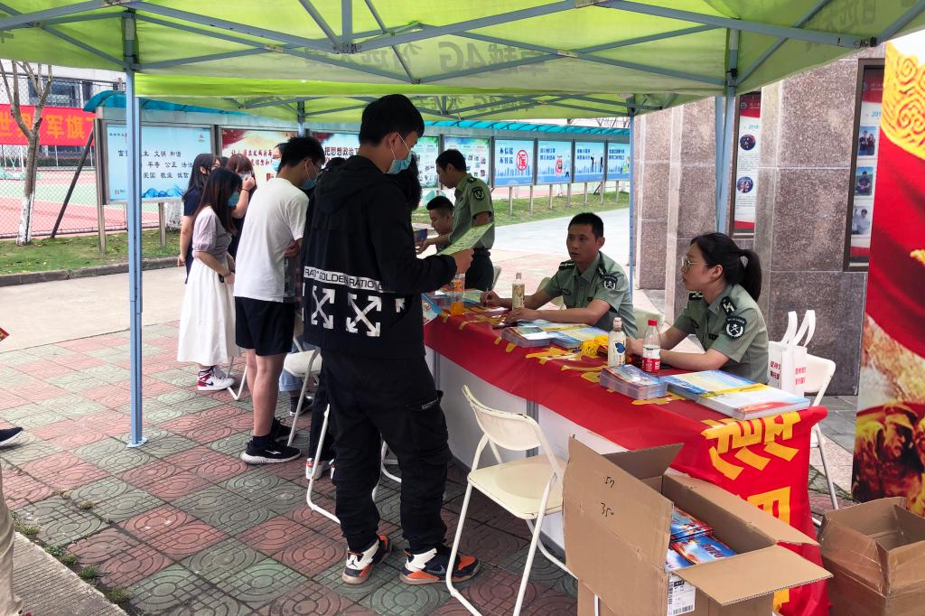 在咨询活动现场,工作人员为有应征意向的学生耐心解疑答惑,分发征兵宣传单,进一步向同学们详细解读参军入伍的优惠政策及相关要求。