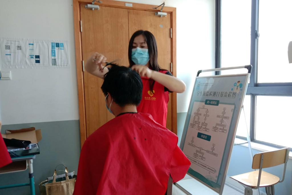 5月24日中午,炎炎烈日下,来自岱山竹屿社区的两位理发师志愿者不畏高温,放弃周日休息时间和门店生意,专程前来石油化工学院无偿为在校学生理发。