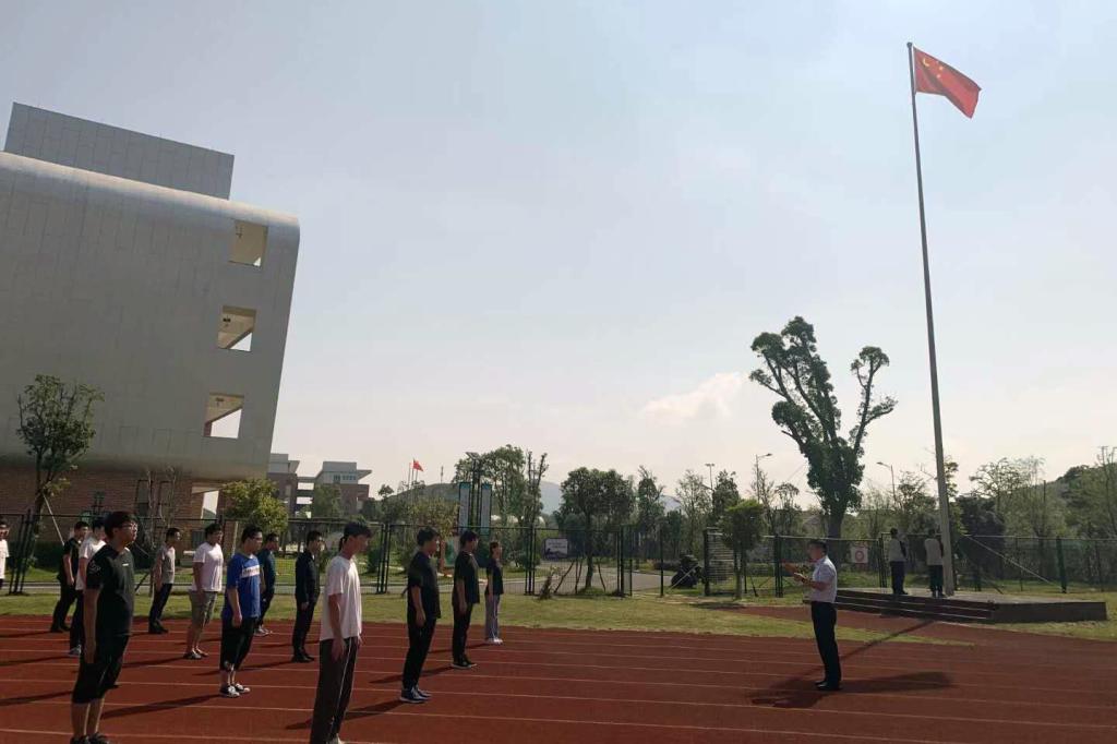 在嘹亮的国歌声中,鲜艳的五星红旗在校区田径场上空冉冉升起。全体留校学生精神饱满、身姿挺拔,目光注视着冉冉升起的国旗。