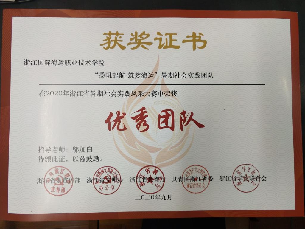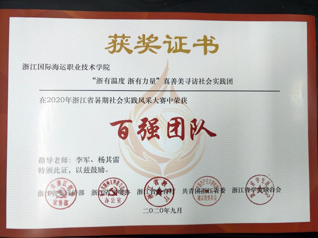近日,由省委宣传部、省文明办、省教育厅、团省委、省学联共同主办的2020年浙江省暑期社会实践风采大赛下发获奖文件,我校申报的航海工程学院“浙有温度 浙有力量”真善美寻访暑期社会实践团获得“百强团队”荣誉称号,校团委“青春逆行无悔,海小豚‘疫’往无前”暑期社会实践团和海洋旅游学院“扬帆起航,筑梦海运”暑期社会实践团获得“优秀团队”荣誉称号。