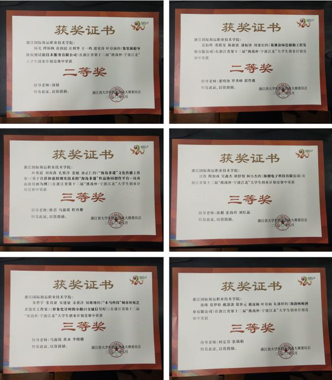 本届大赛伊始,校团委联合教务处、科研处、致远创业学院,通过学生自荐、学院推荐、校赛获奖等方式在全校范围内广泛动员师生积极申报校赛项目,共征集校赛作品165件。在此基础上,最终遴选出7个项目参加省级比赛。经过专业老师的悉心指导和参赛学生的全情投入,最终,船舶工程学院的《基滩涂绿色船舶工程发展有限公司》项目和《集装箱船导轨检测试箱技术服务有限公司》项目荣获二等奖,船舶工程学院的《海创电子科技有限公司》项目、港口管理学院的《“海岛非遗”文化传播工作室的<基于社群和虚拟现实技术的“海岛非遗”作品协同创作平台——以舟山渔民画为例>》项目、海洋旅游学院的《海韵杨梅酒业有限公司》项目、国际教育学院的《“木马科技”城市环境艺术设计工作室的《形象化计时的小路口交通信号灯》》项目荣获三等奖。
