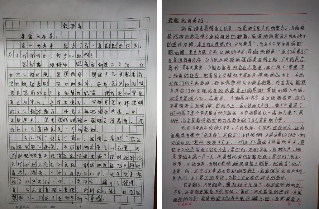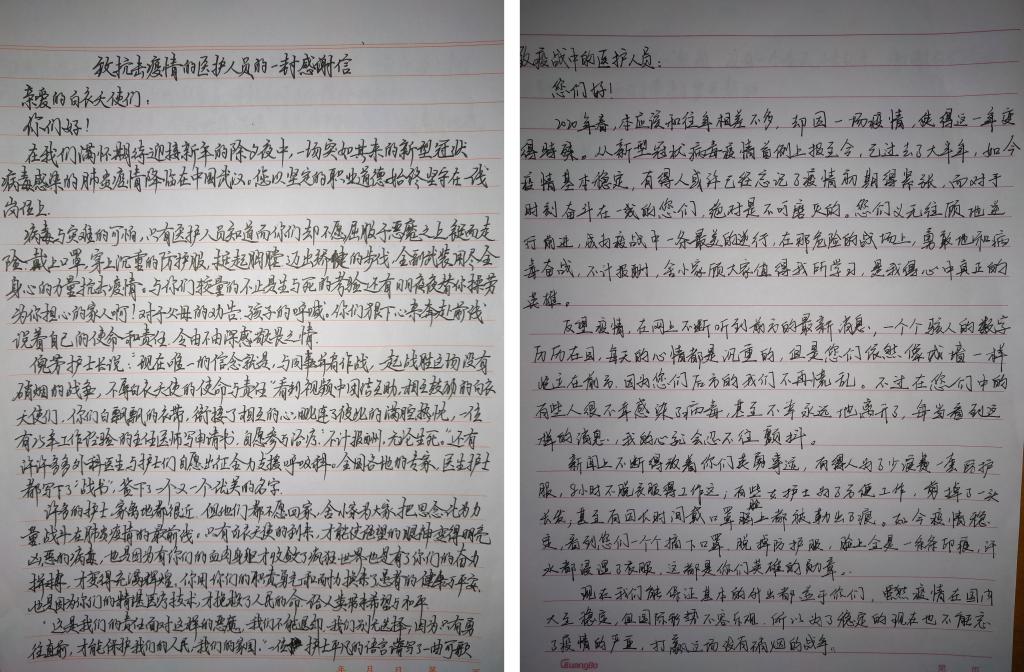 经过同学们的积极参与、热情投稿,航海工程学院共收集了八十多篇感谢信。在这其中,我们能看到写给白衣天使的一封信:“与你们较量的不只是生与死的考验,还有日日夜夜替你操劳为你担心的家人啊!”浸透的白大褂连接了相互的心,毗连了彼此的满腔热血。同学们在信中向这些奔赴一线的医护人员们真挚地表示感谢。