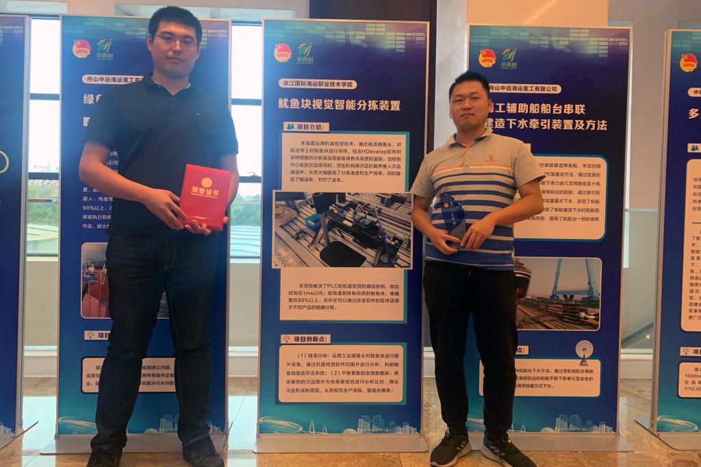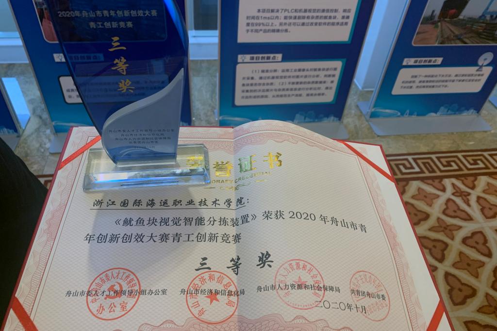 “拥抱数字经济 青春创享未来”,10月15日,在由市委人才办、市经信局、市人社局和团市委共同主办的2020年舟山市青年创新创效大赛颁奖仪式暨优秀成果发布会上,我校船舶工程学院苗家明、何琪、徐鹏教师团队的创新项目《鱿鱼块视觉智能分拣装置》荣获三等奖,成为获奖的唯一一个高校团队。