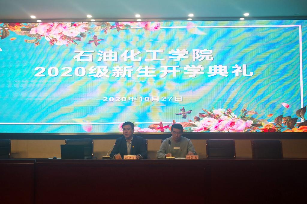 10月26日晚,石油化工学院在岱山校区报告厅举行了2020级新生开学典礼,石油化工学院党支部书记郑忠义,副院长柏昌顺,辅导员孙丹晔、徐晓雨以及2020级新生班班主任等参加了本次开学典礼。