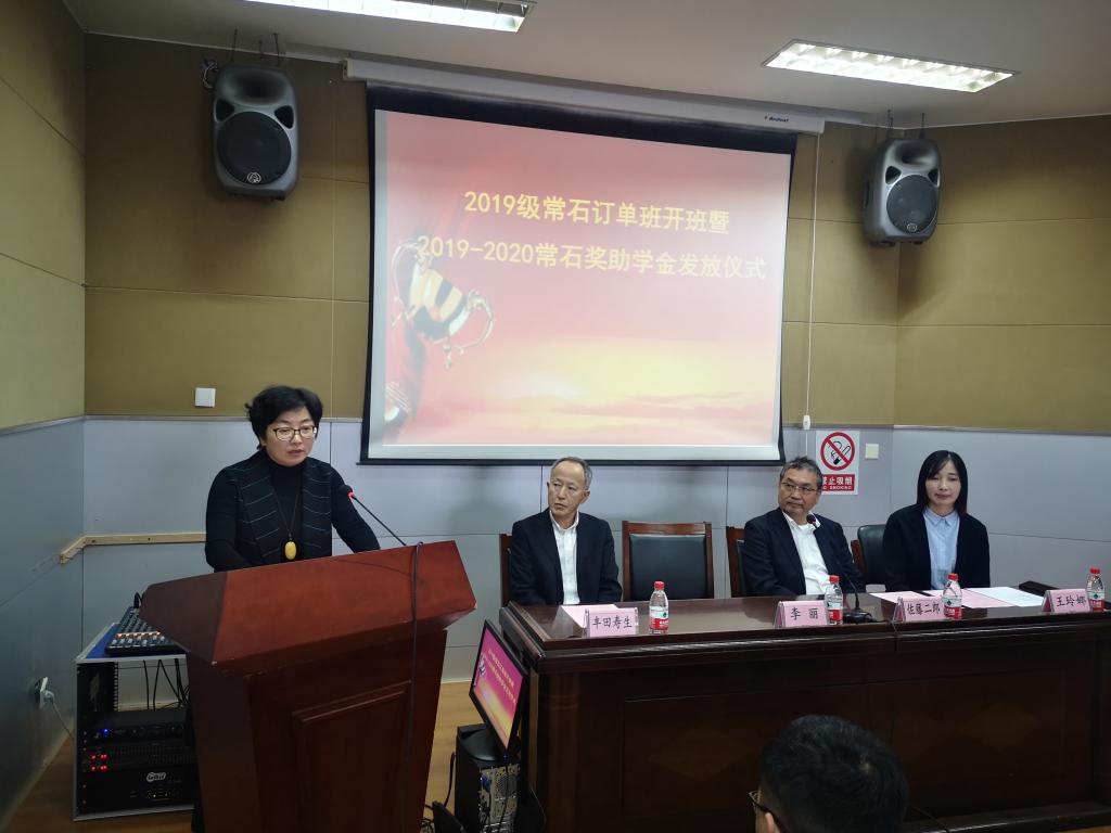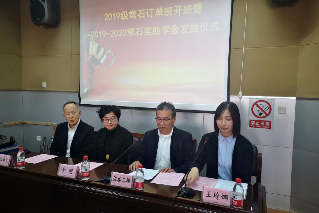 常石公司总经理佐藤二郎、总经理助理丰田寿生代表企业分别发言,对2019级常石班的同学以及获得常石奖助学金的同学表示真诚的祝贺,对常石集团和我校的长期友好合作成果表示肯定,同时欢迎同学们在今后的学习、实习就业中进一步了解常石、加入常石。