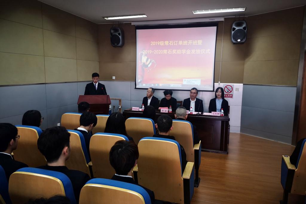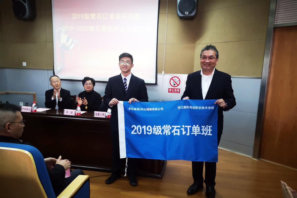 11月13日,船舶工程学院在船舶实训楼万邦厅举行2019级“常石”订单班开班暨2019-2020学年奖助学金发放仪式。常石集团(舟山)造船有限公司总经理佐藤二郎、总经理助理丰田寿生、人事课长姚杰等企业来宾出席仪式。副校长李丽代表学校出席仪式。仪式由船舶工程学院党总支书记罗秀峰主持。学校教务处副处长郭娟、校企合作中心徐飞翔、船舶工程学院副院长虞艳娜、学院教师代表、辅导员以及2019级常石订单班班全体学生参加了仪式。