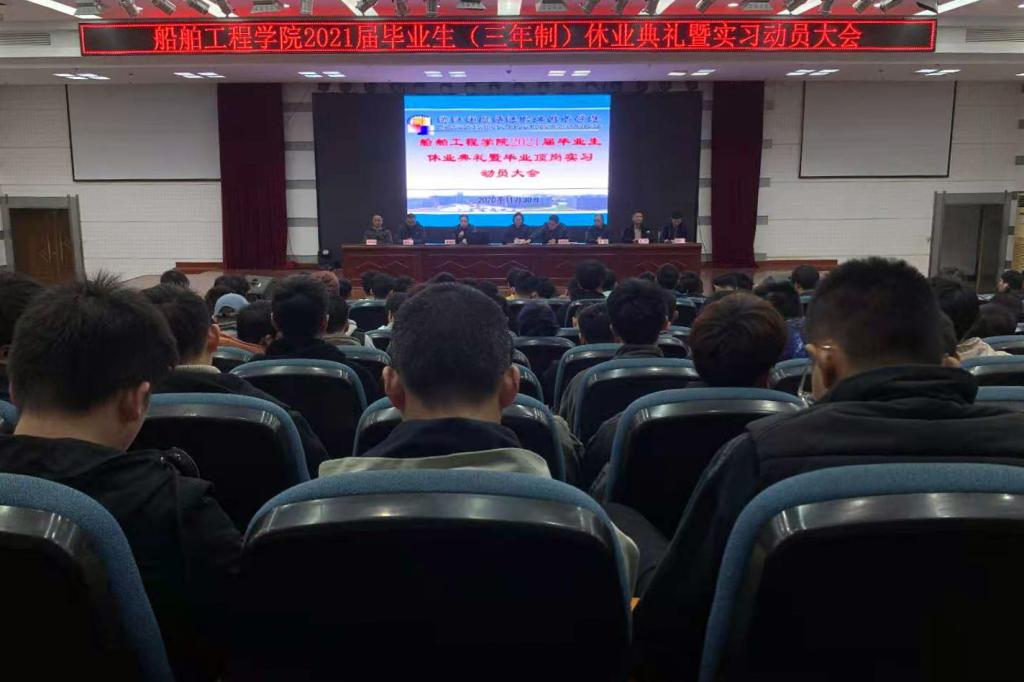 11月30日,船舶工程学院在图书馆四楼报告厅举行2021届毕业生(三年制)休业典礼暨毕业实习动员大会。船舶工程学院行政班子、专业团队负责人、相关班级学业导师和辅导员及全体2021届毕业生参加了会议。会议由船舶工程学院办公室主任蒋仲仁主持。