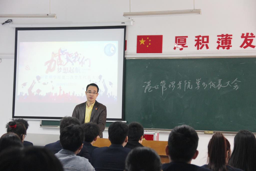 苏峰代表港口管理学院党总支对大会的召开表示热烈祝贺,向全院青年学生致以亲切的问候。苏峰指出,五年来,学院学生会在学院党总支、校团委的坚强领导和大力支持下,团结和带领广大青年同学,积极探索体现时代特征、彰显学院特色的学生会工作新路子,取得了突出的成绩,学院党总支对学生会工作充分肯定,对广大青年充分信任并寄予厚望。