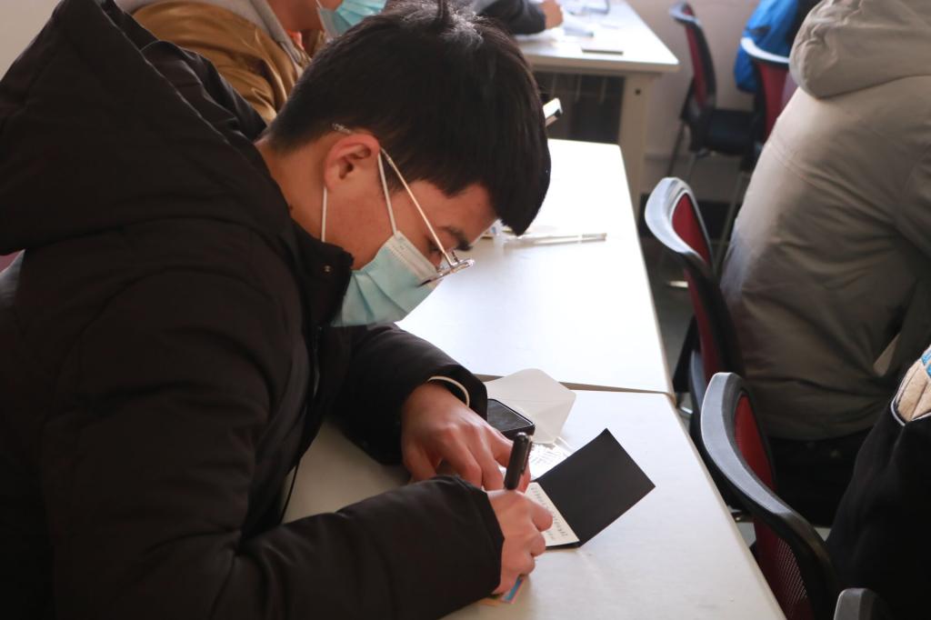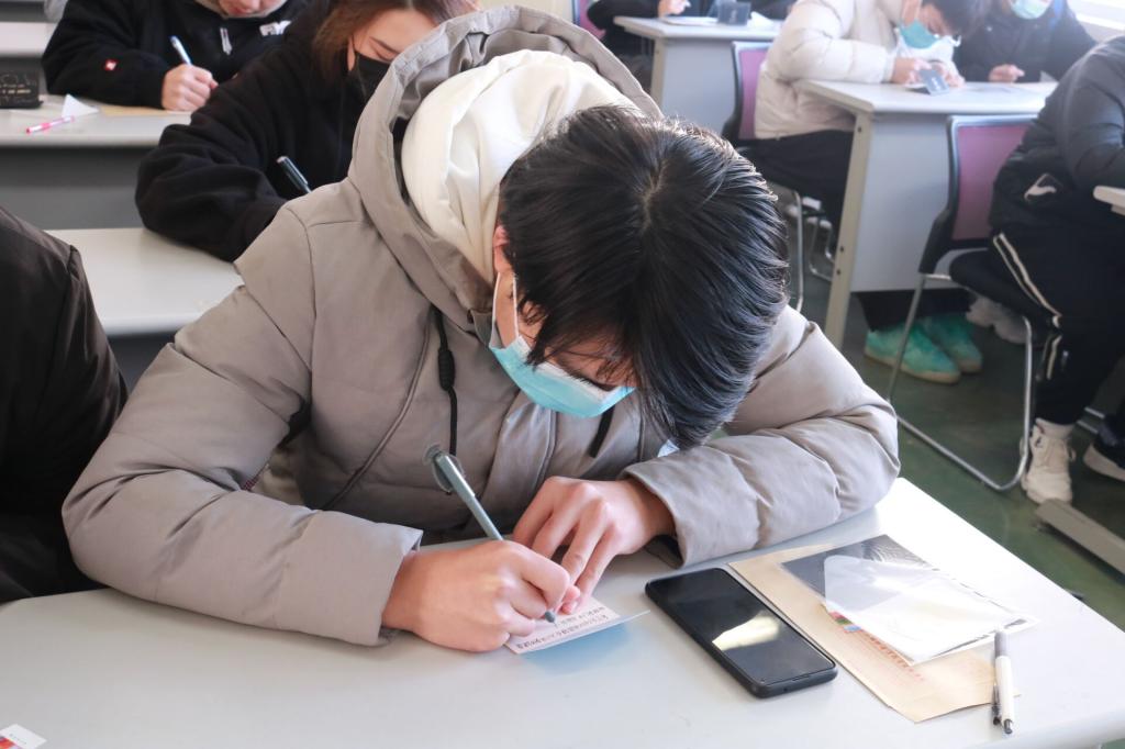 早晨8点,同学们纷纷早起来到了1312活动教室,自觉带上了口罩,挑选喜欢的卡片给自己的家人、朋友写上了新年祝福。