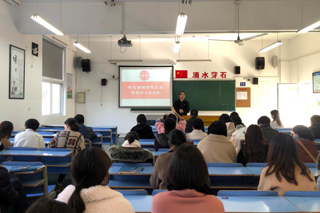 会议第一阶段由港口管理学院党总支书记苏峰主持,他简单回顾了上届工会工作。工作报告后,与会教职工以举手表决的形式进行了选举,一致同意由港口管理学院党总支副书记傅红波担任新一任港口管理学院工会主席。随后,傅红波作了表态发言:一是个人要多学习多请教,确保能够尽快熟悉适应工作;二是希望广大教职员工要多支持多监督,确保最大限度维护教职员工利益。