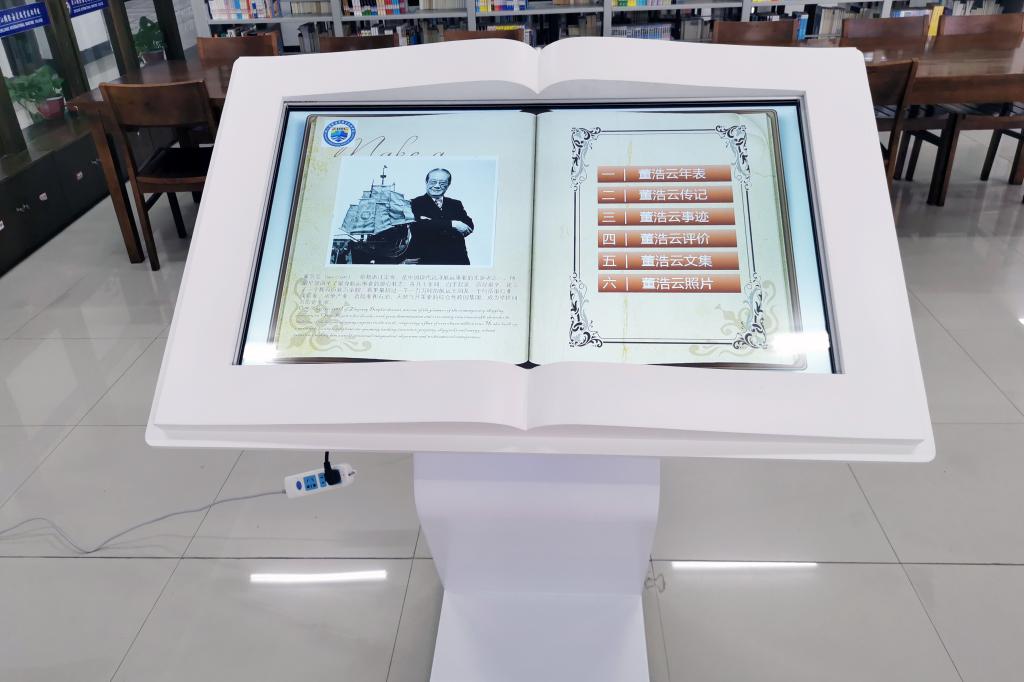 董浩云专题特色数字资源库设立于图书馆三楼综合阅览室。资源库采用翻开的书籍造型,共分为董浩云年表、董浩云传记、董浩云事迹、董浩云评价、董浩云文集、董浩云照片六大版块,将《董浩云日记》、《董浩云的世界》,《世界船王》、《中国现代航运先驱》等纸质图书数字化,用生动的照片、资料浓缩了“世界七大船王”之一的董浩云传奇的一生,在这位期盼“四海一家”的跨国企业家身上,拥有不变的中国心,彰显了董浩云先生现代航运的先驱精神。