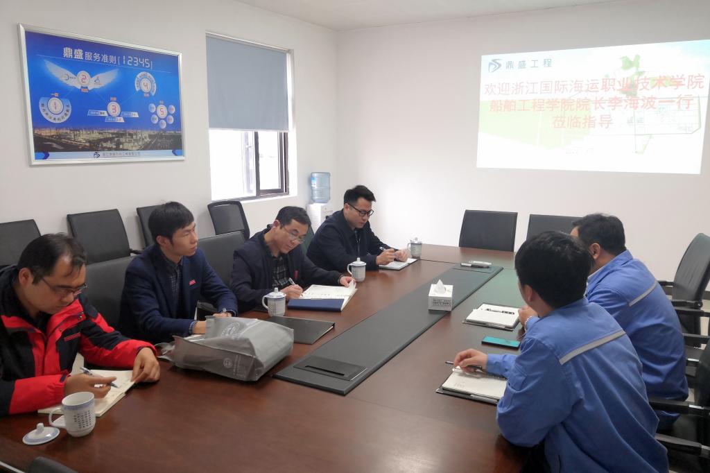 最后,校企双方进行了座谈会。会上,公司副总经理胡杰介绍了企业基本情况和未来几年的发展规划,对进一步拓展校企合作人才培养,特别是人才本土化提出了建议。李海波介绍了船舶工程学院的基本情况,并对校企合作开设订单班、社会培训与科研服务、开设企业课程等方面提出了建议和思路。双方达成共识,接下来将合作开设“鼎盛订单班”、“鼎盛奖学金”;拓展相关中职院校开展5年制合作定向培养,提高学校在舟就业率,促进企业人才本土化;同时继续深化在课程建设、社会培训、科研服务方面的合作。