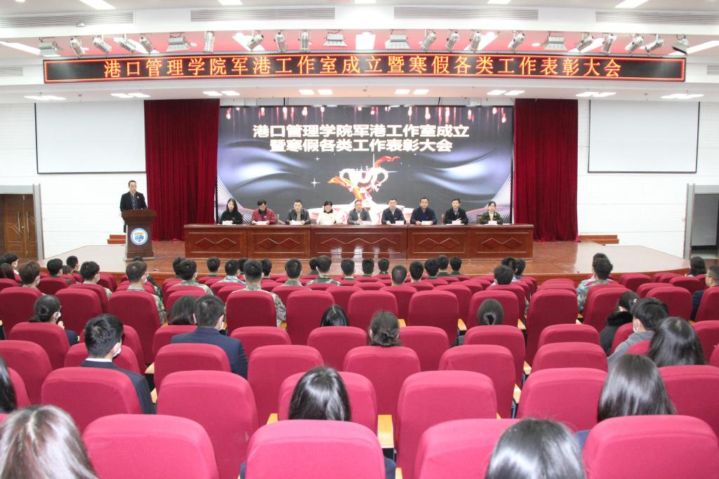为庆祝中国共产党成立100周年,结合党史学习教育,创新学院党建思政工作载体,3月17日下午,港口管理学院军港工作室成立暨寒假各类工作表彰大会在图书馆报告厅隆重举行。校党委委员、副院长曹志斌,宣传(统战)部部长陈永芳,学生工作部部长芮明珠,教务处处长史方敏,招生就业办公室主任吴平波,港口管理学院院长王贵斌、副院长何伟、党总支副书记傅红波出席会议,学院全体教职工、军港工作室成员及获奖学生代表近250人参加。会议由港口管理学院党总支书记苏峰主持。
