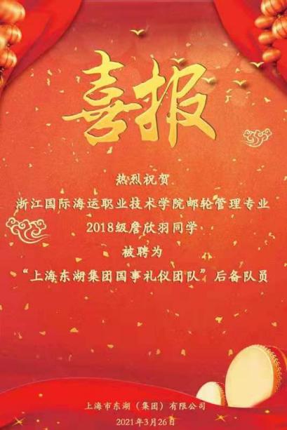 值此庆祝建党100周年之际,3月26日,海洋旅游学院收到了来自上海东湖宾馆的一则喜报,学院2018级国际邮轮乘务管理4班的詹欣羽同学成功入选“上海东湖集团国事礼仪团队”,她将参与接待上海最高层领导的活动。