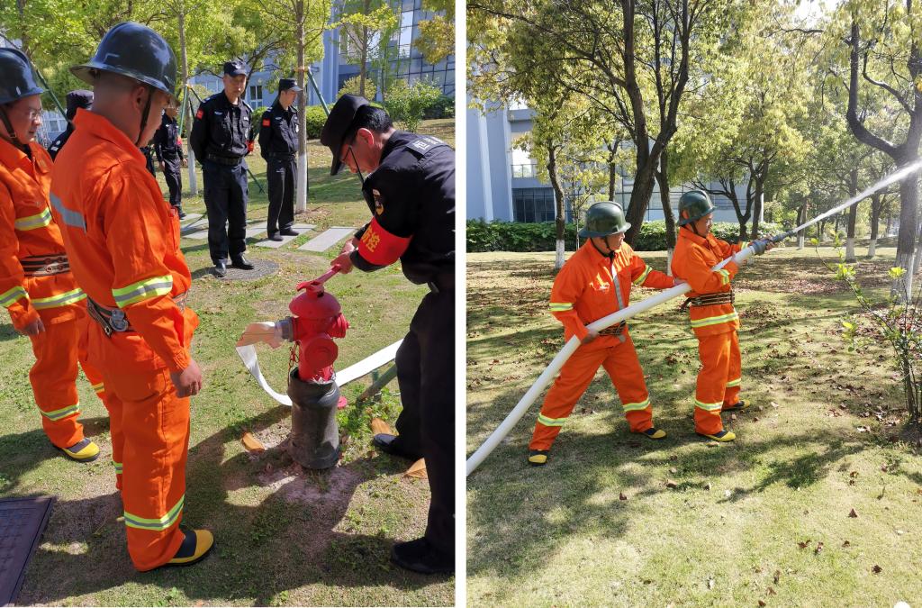 随后,消防队员立即赶往模拟发生火情的海贤楼南侧区域,使用灭火器和消火栓快速灭火,整个过程衔接紧密,达到了初期火灾扑救的初衷。
