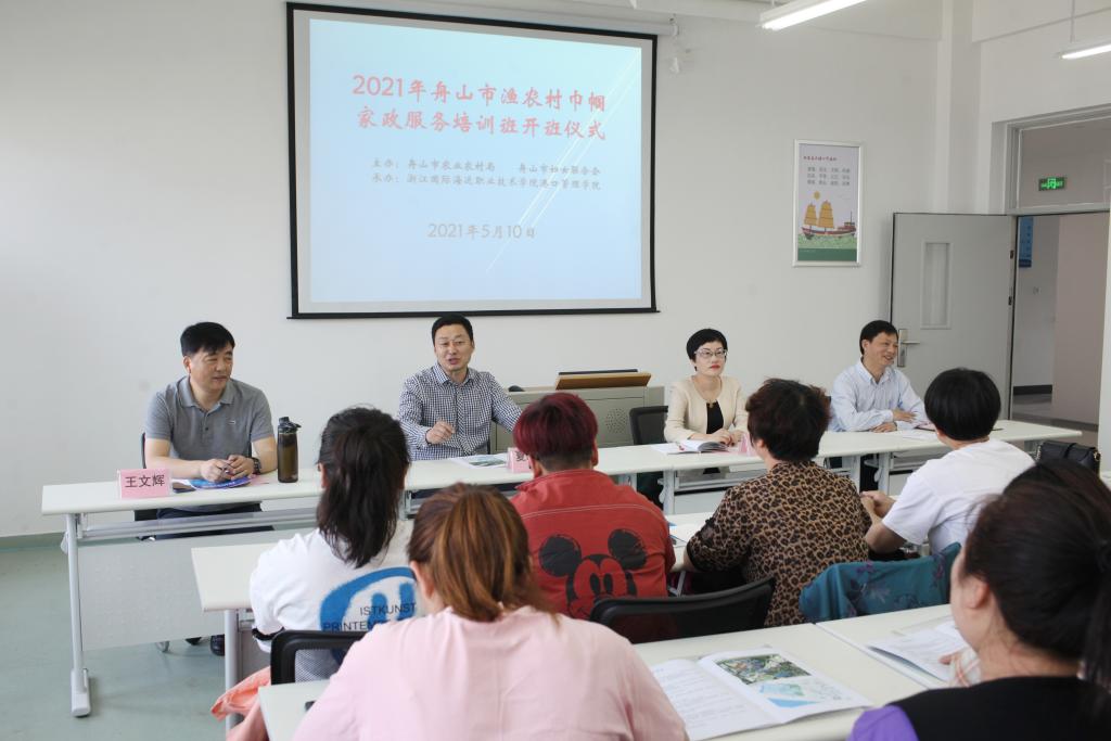 5月10日上午,由舟山市农林局、舟山市妇联主办,我校港口管理学院承办的2021年舟山市渔农村巾帼家政服务培训班,在社会服务中心303室举行开班仪式。舟山市妇女联合会副主席刘晓芬,舟山市农业农村局党组成员、四级调研员、副局长王文辉,我校校党委委员、副校长夏志刚出席了仪式。开班仪式由港口管理学院院长王贵斌主持。