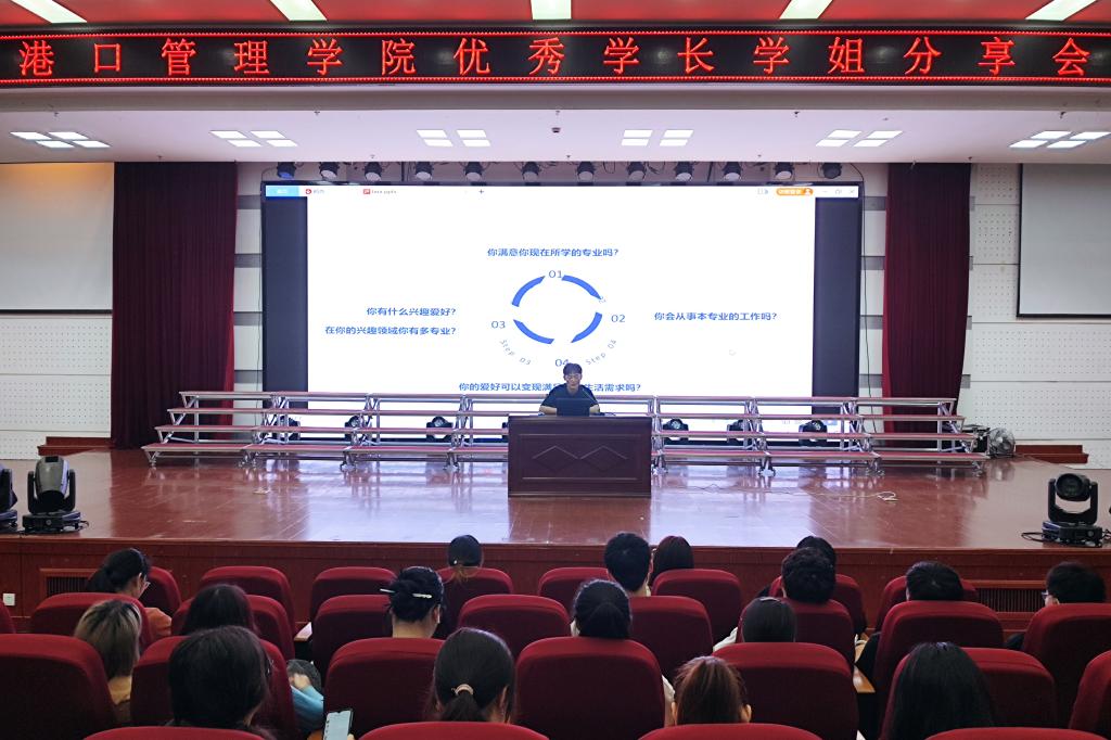 5月13日晚,港口管理学院在图书馆报告厅顺利举行“优秀学长学姐分享交流会”,来自2019级商务英语1班胡铭壬、蒋飞情,2018级商务英语3班的余泽舟和2018级物流管理3班的单英杰四位优秀学子分别分享了他们在实习工作、学习经历的收获和感悟。