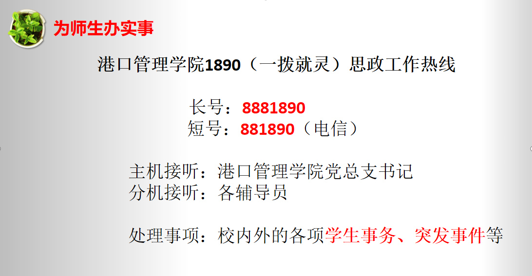 6月3日中午,港口管理学院党总支书记苏峰在图书馆报告厅举行的“平安护航建党百年”学生安全动员会暨创建省级文明校园动员会上正式宣布,1890 思政工作热线正式开通。据悉,港口管理学院通过1890思政工作热线为学生提供热情、高效、便捷、周到的思政服务工作,旨在打造港口管理学院党建思政品牌服务窗口。服务热线号码为8881890,热线电话主机接听为港口管理学院党总支书记,分机接听为各值班辅导员,全天候24小时受理学生来电,主要处理校内外的各项学生事务、突发事件等。