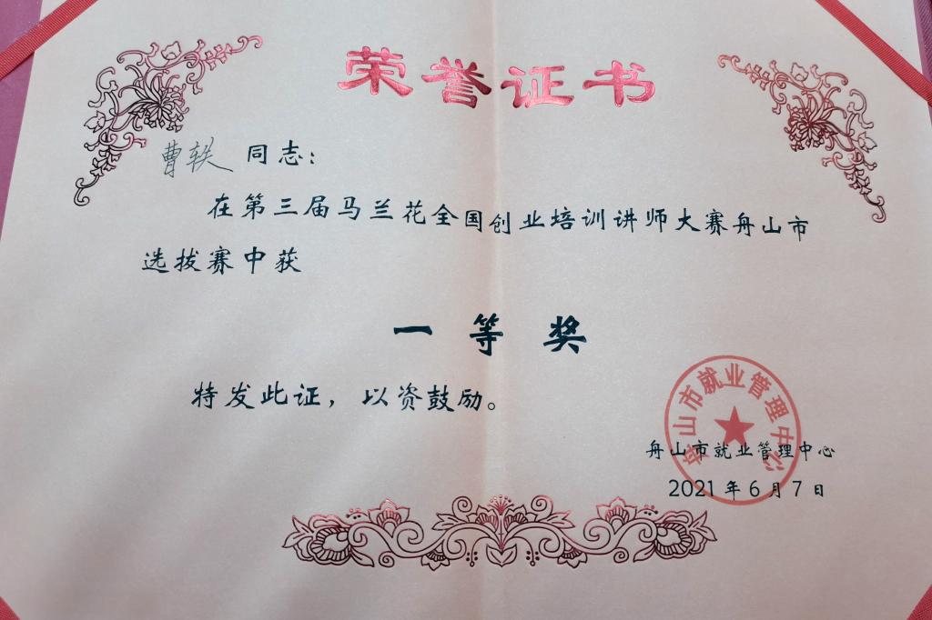 6月7日,由舟山市就业管理中心主办、普陀区就业管理中心承办的“第三届马兰花全国创业培训讲师大赛舟山选拔赛”在舟山旅游商贸学校举行。我校由致远创业学院推荐的社科体艺部思政老师、省级创业导师兼SYB培训导师曹轶获得一等奖。