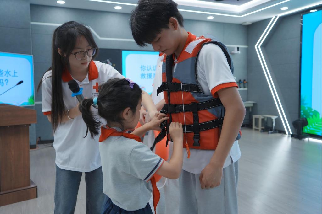 团队先后走进岱中小学、高亭小学,通过“情景剧+实操”模式,把溺水自救、AED使用等关键技能搬上讲台。孩子们在仿真水域教具前轮流演练,“沉浸式”体验让安全意识入脑入心。