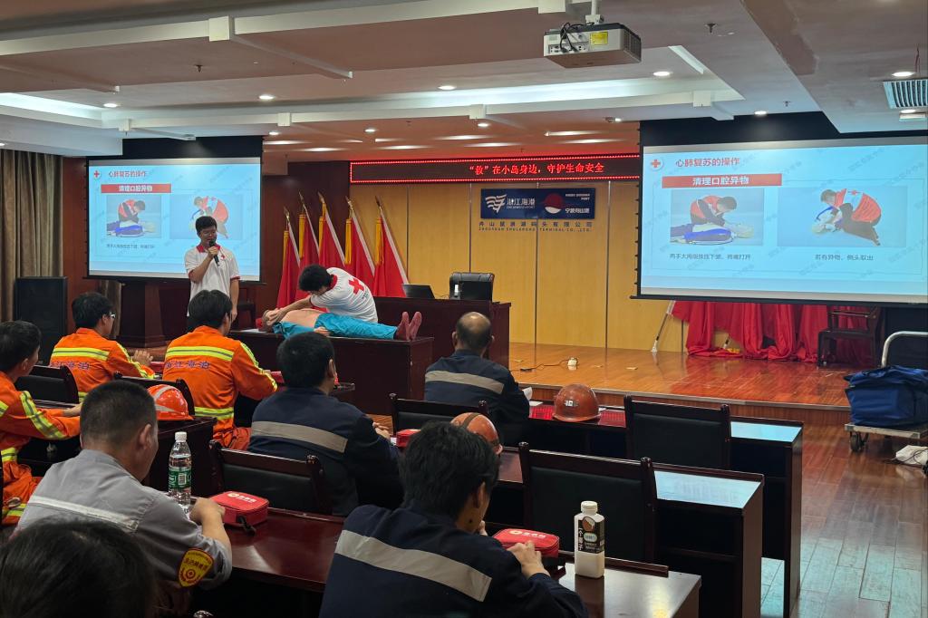 7月2日,团队从岱山本岛出发,两次转船、颠簸2小时后抵达舟山鼠浪湖码头有限公司。海风裹挟着咸腥与热浪,码头作业声此起彼伏。队员们针对海上高发的创伤、中暑、心脏骤停三大险情,现场演示简易夹板固定、船载急救包配置,并指导码头工作人员完成CPR实操。