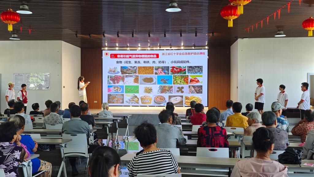 7月1日-8日,团队兵分多路,足迹遍及蓬莱社区、司基村、桥头社区、东沙社区等8个村社。志愿者用方言结合案例,手把手教授气道异物梗阻解除、止血包扎等“救命绝活”;在岱山县润家康悦颐养院,护工们反复练习“剪刀石头布”急救口诀,为长者安全再添一道屏障。