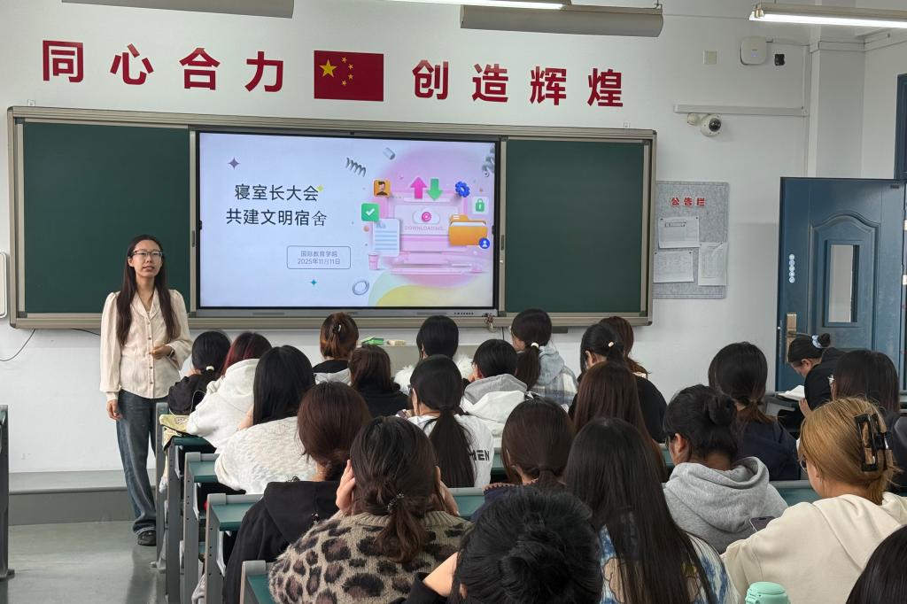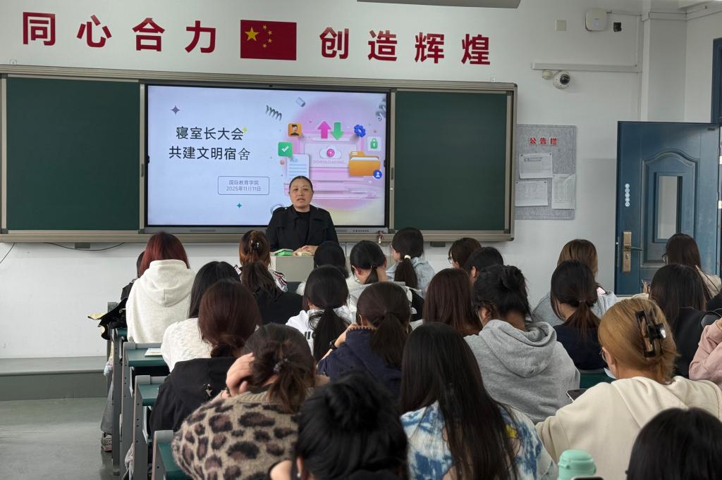 11月11日,国际教育学院2025-2026学年第一学期寝室长培训会议在海智楼1406举行,会议由辅导员方芳老师主持,学院党总支副书记虞艳娜和全体寝室长参加会议。会议聚焦学院“一站式”学生社区建设、学生社区网格化管理、学生日常管理“三个专项”、寝室安全等工作任务。方芳老师展示学院优秀寝室和待改进寝室情况,进一步明确学校文明寝室创建的要求,明确寝室长的职责和要求。