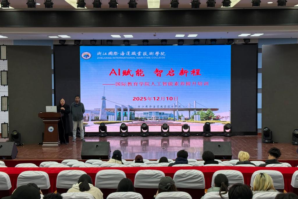 为进一步提升学生用人工智能解决复杂问题的能力、激发创新思维、提升未来就业竞争力,12月10日下午,国际教育学院在图书馆四楼报告厅举行“AI赋能 智启新程”人工智能素养提升培训,培训由原现代港口贸易学院教授、舟山市人才办聘舟山智慧海洋产业工程师协同创新中心智慧海洋工程师、舟山市大数据局聘舟山市政府投资信息化项目专家库专家周剑敏主讲,学院全体2024级、2025级学生参加培训。培训由国际教育学院党总支副书记虞艳娜老师主持。