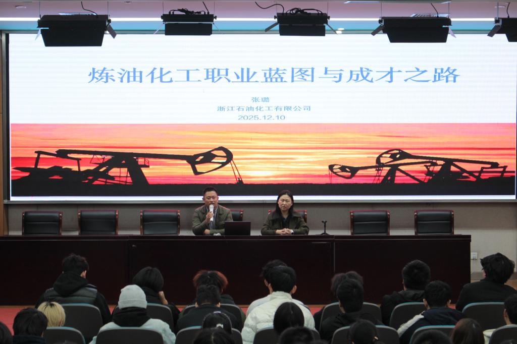 在报告厅举行的专题讲座中,学院特邀浙江石油化工有限公司研发中心主管张璐主任担任主讲。张璐以《炼油化工职业蓝图与成才之路》为题,系统阐述了专业发展路径、岗位类型、薪资福利及成长建议,为学生带来了一场内容充实、导向明确的行业分享。她指出,石化产业贯穿国民经济与日常生活,产业链长、覆盖面广,蕴藏着丰富的就业机会。她殷切建议同学们在校期间务必夯实专业基础,并积极考取相关职业资格证书,为未来竞争力加码。