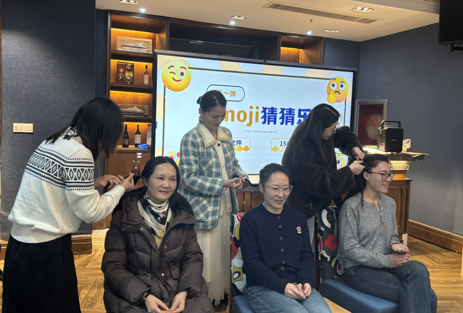 在接下来的新春联欢环节中,现场气氛热烈、笑语不断。由各办公室组成的参赛队伍踊跃参与了“巧手织锦绣 欢乐编发”、“emoji猜猜乐”、“拼字大挑战”系列趣味游戏竞赛。老师们在轻松愉快的互动中增进了情谊,展现出昂扬向上的精神风貌。