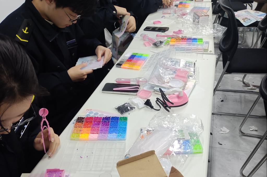 活动现场缤纷多彩,各色拼豆、多款造型模板整齐摆放,工作人员细致讲解拼豆制作技巧、流程及安全注意事项,为同学们的创作保驾护航。大家手持镊子,以彩豆为料,专注镶嵌拼搭,在方寸模板间勾勒创意。创作中,同学们互帮互助、灵感共享,遇难题彼此支招,享技巧主动分享,欢声笑语间,温暖情谊悄然传递。