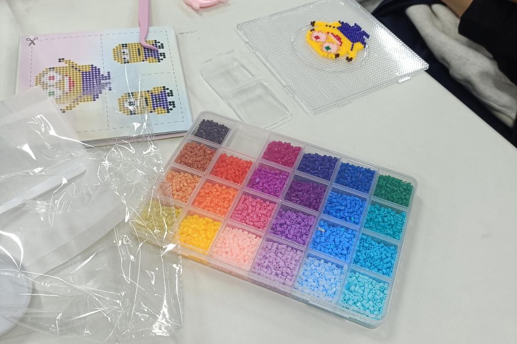 经过选豆配色、拼接定型,零散拼豆化为一件件精致的挂件、摆件,独一无二的手作成果满是巧思。同学们手捧作品拍照留念,成就感与喜悦溢于言表,每一件作品都定格了春日里的治愈时光。