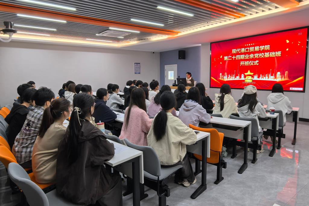4月23日中午,现代港口贸易学院第二十四期业余党校基础培训班在4117教室顺利开班。学院党总支副书记邵佩华出席仪式致辞,并讲授开班第一课。仪式由学院专职组织员陈姿霖主持。
